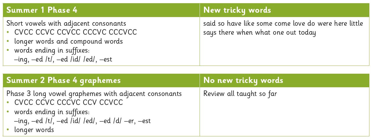 Children will be introduced to suffixes. An overview of the phase 4 programme is below. This work will bridge the learning from Reception into Year 1, where htye will review phase 4 at the beginning of their Year 1 phonics curriculum.